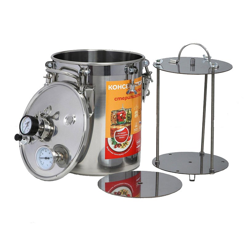 Объем (л): 14 Материал: пищевая нержавеющая сталь Вместимость банок: 0,5 л. - 8 шт, 0,7 л. - 4 шт, 1,0 л. - 3 шт, 3л. - 1 шт. Можно использовать 1,5л, и 2л. Нагрев: да Температура консервации: 102-112С° Тип плит: все, включая индукционные Охладитель ( Дефлегматор): нет Узел автоматического сброса избыточного давления: да Сухопарник: нет Контроль температуры: да Контроль давления: да Манометр: да Термометр: да Комплектация: термометр,манометр,клапан избыточного давления Особенности: капсульное дно Цвет: нержавеющая сталь Вес (кг): 5.5 Глубина: 25 см Ширина (см)..: 25 Высота (см): 34 Гарантия: 12 месяцев Страна производитель: РоссияТип: автоклав-стерилизатор