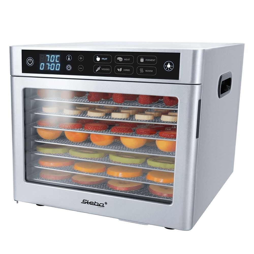 Для сушки фруктов, овощей, трав и многого другого Корпус из нержавеющей стали Светодиодный дисплей панели управления 8 полок из нержавеющей стали 30*28 см Подсветка камеры Автоматические программы для сушки фруктов, овощей, мяса, трав, йогурта, подогрев Электронный контроль температуры от 30 до 85 градусов Таймер от 1 до 24 часов Общая площадь сушки ок. 0,67 кв.м. В комплекте силиконовый коврик для сушки трав
