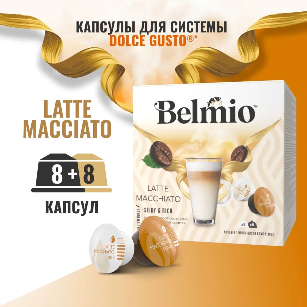 BELMIO - премиальный кофе в капсулах Dolce Gusto Belmio из Бельгии (капсулы, совместимые с кофемашинами Dolce Gusto). Капсулы Dolce Gusto BELMIO – это только самые лучшие зерна, правильная обжарка и идеальная пенка! БЛЕНД. Наш Латте Маккиато — это смесь арабики и робусты, созданная специально для тех, кто любит побаловать себя сливочным кофейным напитком. Насыщенный кофе с нотками карамели, шоколада и бисквита в сочетании с бархатистым молоком. Идеально подходит для утреннего наслаждения, а также для заслуженного отдыха во второй половине дня. В каждой коробке 8 капсул с молотым кофе и 8 капсул с молоком. Размер чашки: 200 мл + 35 мл/Эспрессо + Молоко, Профиль вкуса: Шелковистый и богатый.НАТУРАЛЬНЫЙ СОСТАВ: кофе жареный молотый, Молоко сухое цельное, сахар (10%), натуральный ароматизатор.ПРЕМИАЛЬНЫЙ КОФЕ. Капсулы кофе Dolce Gusto BELMIO - это только отборный кофе класса спешелти. Мы выбираем ?самые лучшие зерна арабики и робусты со всего мира, которые мастерски обжариваем, и создаем уникальные миксы с неповторимым вкусом и ароматом. Только 10% лучших кофейных зерен отбираются и попадают в вашу чашку! Почувствуйте пленительную силу кофейного аромата, насладитесь бархатистым, насыщенным вкусом и идеальной пенкой! ИДЕАЛЬНАЯ ПЕНКА. Belmio гарантирует идеальную кофейную пенку, которая сделает вашу чашку кофе еще вкуснее!СЕРТИФИЦИРОВАН RAINFOREST. Весь кофе Belmio сертифицирован Rainforest Alliance. Маленькая зеленая лягушка Rainforest Alliance является символом защиты окружающей среды, социальной и экономической ответственности при производстве сельскохозяйственной продукции по всему миру.