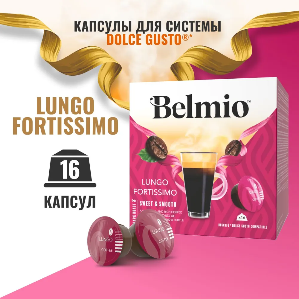 BELMIO - премиальный кофе в капсулах Dolce Gusto Belmio из Бельгии (капсулы, совместимые с кофемашинами Dolce Gusto). Капсулы Dolce Gusto BELMIO – это только самые лучшие зерна, правильная обжарка и идеальная пенка! БЛЕНД.Этот мощный Lungo Fortissimo сочетает в себе лучшие сорта латиноамериканской арабики, что делает его отличным выбором. Подайте себе чашку кофе рано утром, чтобы насладиться его крепким и полным вкусом. Мы обещаем вам, что его богатство станет началом вашего дня. Лунго Фортиссимо лучше всего пить в виде лонг-кофе с молоком или без него. 100% арабика. Темная обжарка. В каждой коробке 16 капсул с молотым жаренным кофе. Размер чашки: 120 мл/Лунго, Профиль вкуса: Сладкий и гладкий.НАТУРАЛЬНЫЙ СОСТАВ: Кофе жареный натуральный молотый.ПРЕМИАЛЬНЫЙ КОФЕ. Капсулы кофе Dolce Gusto BELMIO - это только отборный кофе класса спешелти. Мы выбираем ?самые лучшие зерна арабики и робусты со всего мира, которые мастерски обжариваем, и создаем уникальные миксы с неповторимым вкусом и ароматом. Только 10% лучших кофейных зерен отбираются и попадают в вашу чашку! Почувствуйте пленительную силу кофейного аромата, насладитесь бархатистым, насыщенным вкусом и идеальной пенкой! ИДЕАЛЬНАЯ ПЕНКА. Belmio гарантирует идеальную кофейную пенку, которая сделает вашу чашку кофе еще вкуснее!СЕРТИФИЦИРОВАН RAINFOREST. Весь кофе Belmio сертифицирован Rainforest Alliance. Маленькая зеленая лягушка Rainforest Alliance является символом защиты окружающей среды, социальной и экономической ответственности при производстве сельскохозяйственной продукции по всему миру.