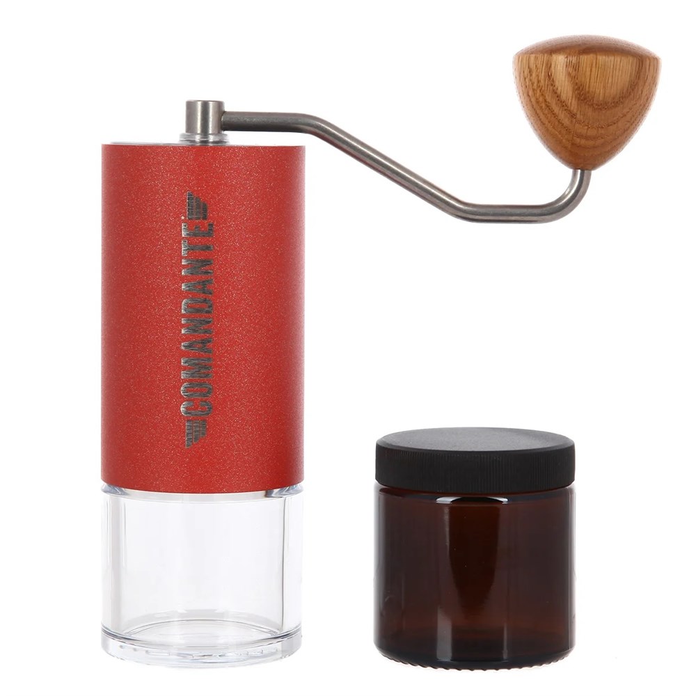 Классический лаконичный дизайн кофемолки COMANDANTE C40 стал символом качества помола мирового уровня. Простота в использовании и безупречное функционирование новейших жерновов NITRO BLADE® в кофемолках COMANDANTE® сделали их лучшим выбором для истинных любителей кофе во всем мире, начиная от производителей кофе и страстных домашних бариста до чемпионов мира по приготовлению кофе. NITRO BLADE® - это результат многолетних исследований и разработок и первые в мире семиугольные конические жернова, созданные специально для specialty кофе. Уникальные физические и химические свойства этих жерновов выгодно отличают COMANDANTE C40 от других ручных кофемолок как по производительности, так и по вкусовым качествам приготовленного кофе. Профессиональная ручная кофемолка с ярким корпусом от известной немецкой компании Comandante. Конические стальные жернова и высокоточная регулировка степени помола. Аксессуар разработан в Германии специально для экспертов, профессиональных бариста и знатоков кофе. Nitro Blade - система особо прочных жерновов, изготовленных из цельного куска стали, насыщенных азотом, что делает их устойчивыми к коррозии. Особенности:Легкая - 740 гДолговечнаяКачественный материалРучка и корпус изготовлены из натурального дереваБлагодаря фиксации центральной оси с помощью двух шариковых подшипников быстро и точно смалывает кофе Comandante C40 MK4 Nitro Blade - новая версия одной из лучших кофемолок в мире. Надежная и высокоточная кофемолка с широким диапазоном помола, сочетающая высокое качество материалов с лаконичным и стильным дизайном. Новое поколение кофемолок Comandante MK4 включает в себя несколько обновлений:Более высокая производительность, прочность и никаких застрявших зерен, благодаря обновленным форме и материалам камеры кофемолкиВ комплект входят две баночки: из коричневого стекла и прозрачного небьющегося полимерного стекла